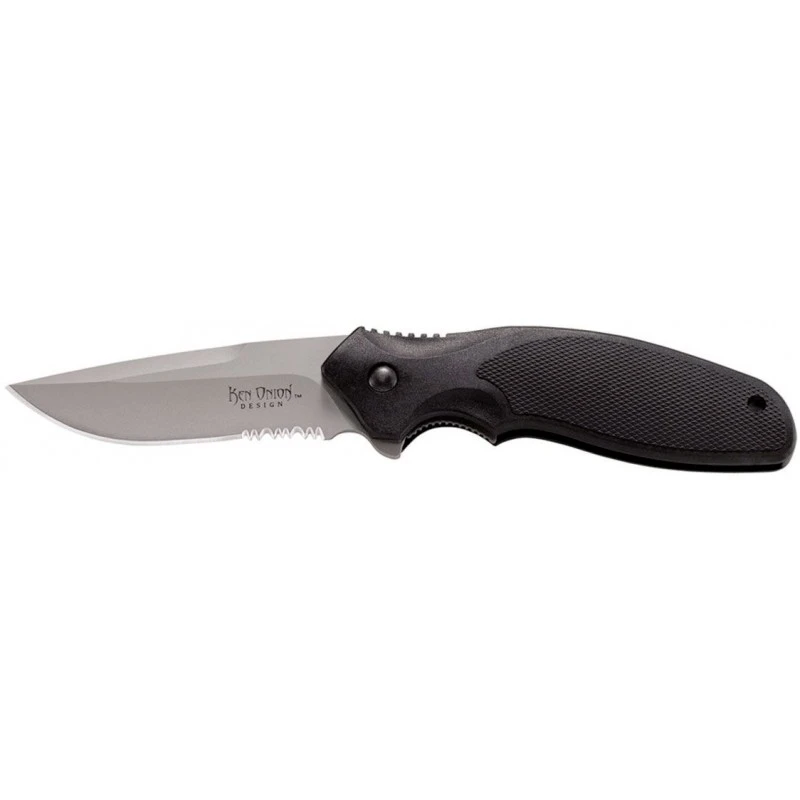 Ce couteau pliant sort sa lame très facilement du manche en tirant simplement sur celle-ci et en s’aidant du flipper (ergot). Vous aurez alors une lame drop point (tombant légèrement vers le bas), hybride (lisse et crantée) en acier inoxydable japonais AUS-8 à finition sablée mate. Cet alliage est particulièrement renforcé contre la corrosion. La lame est sécurisée par le système Liner Lock : il suffit de pousser vers la gauche la pièce située sous le manche pour plier la lame.