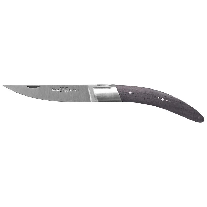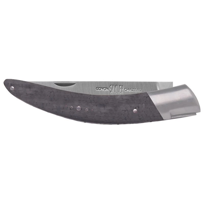Le couteau de poche Stylver est un classique de la maison Goyon Chazeau, entreprise familiale située à Thiers qui fabrique des couteaux artisanaux depuis plus de 3 générations. Différentes versions de ce couteau pliant sont mis en vente, avec notamment un manche en ébène, en olivier, en bois de cade et bien d’autres encore. Vous pourrez retrouver ces différents modèles sur notre site. Celui-ci est pourvu d’un léger et robuste manche noir en fibre de carbone assemblé par rivets. Sa forme ergonomique incurvée le rend particulièrement agréable en main. Moderne et sobre, ce manche est équipé d’une mitre inox et d’un ressort sur son dos soigneusement guilloché à la main, un travail d’orfèvre qui donne à ce couteau un certains prestige. Le Stylver GYSTYLCARF est muni d’une lame à cran forcé d’une effroyable efficacité. Une caractéristique notamment dû à la qualité de sa conception, en acier inoxydable trempé sandvik 12c27. Elle est également facile d’entretien et pérenne. Le Stylver Goyon Chazeau vous sera livré dans une boîte, en présence de son étui en cuir pleine fleur de couleur marron.