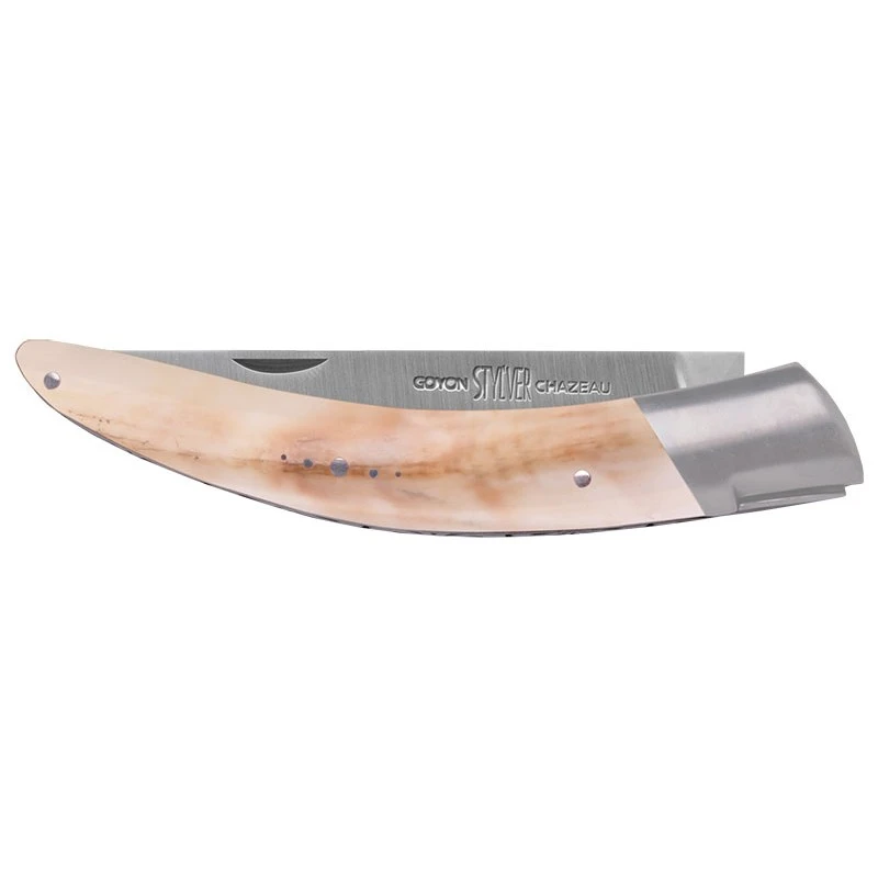 Le Stylver Goyon Chazeau est un couteau fermant de qualité supérieure, inspiré des lignes des couteaux méditerranéens, qui offre une prise en main exceptionnelle grâce à son ergonomie parfaite. Fabriqué de manière artisanale à partir des meilleurs matériaux dans l’atelier thiernois de la marque, ce couteau est doté d’une lame en acier inoxydable trempé Sandvik 12C27 et d’une entablure, avec une double émouture et un cran forcé pour une sécurité optimale. Le manche en ivoire de phacochère est monté par rivets et comporte un ressort forgé guilloché à la main, pour une finition irréprochable.