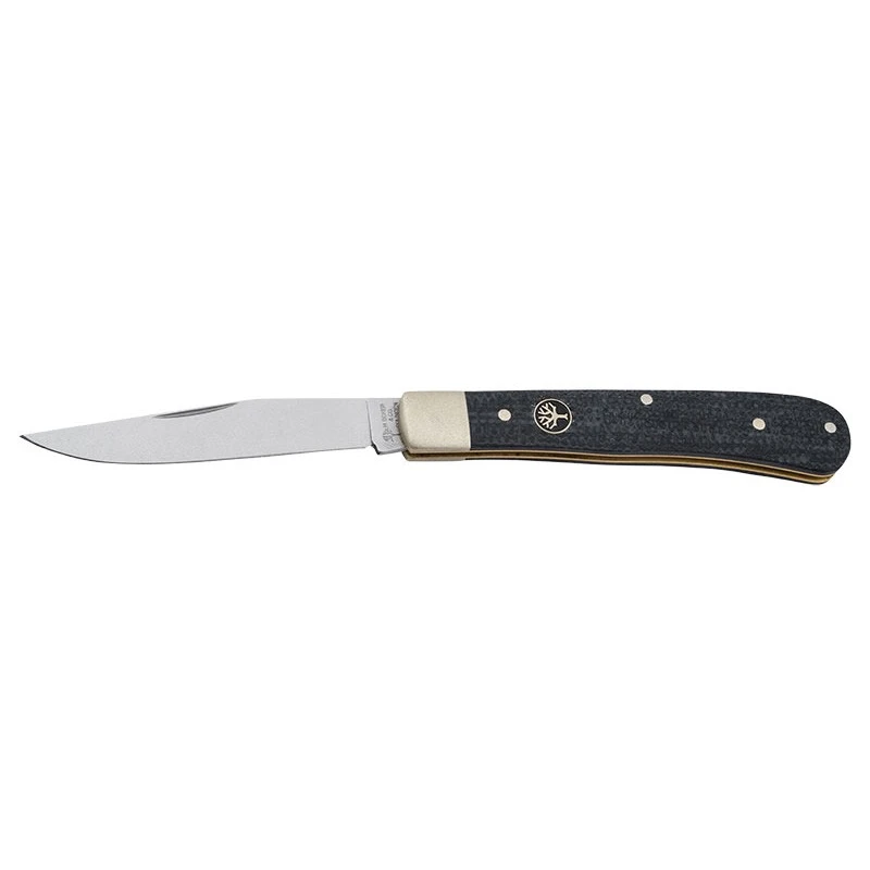 Pour concevoir sa nouvelle version du Trapper Uno, Böker est retourné aux origines du couteau en se basant sur le design classique, puis y a effectué quelques retouches ciblées de manière à donner un style plus moderne, complètement dans l’air du temps. Le Trapper UNO ref.112089 a ainsi vu le jour, avec son look oscillant entre tradition et modernité. Le manche est formé d’échelles de poignée en micarta noir fixées par rivets sur les plaques de laiton. Mitre, rivets et logo Böker en dorée apportent une vraie touche déco au manche. Longue de 80mm, sa lame Drop Point en C75, un acier non-inoxydable qui se patinera rapidement d’une couleur bleu grisatre. Son tranchant s’aiguise facilement. Pour le protéger des rayures, un étui en feutre vous sera également remis.