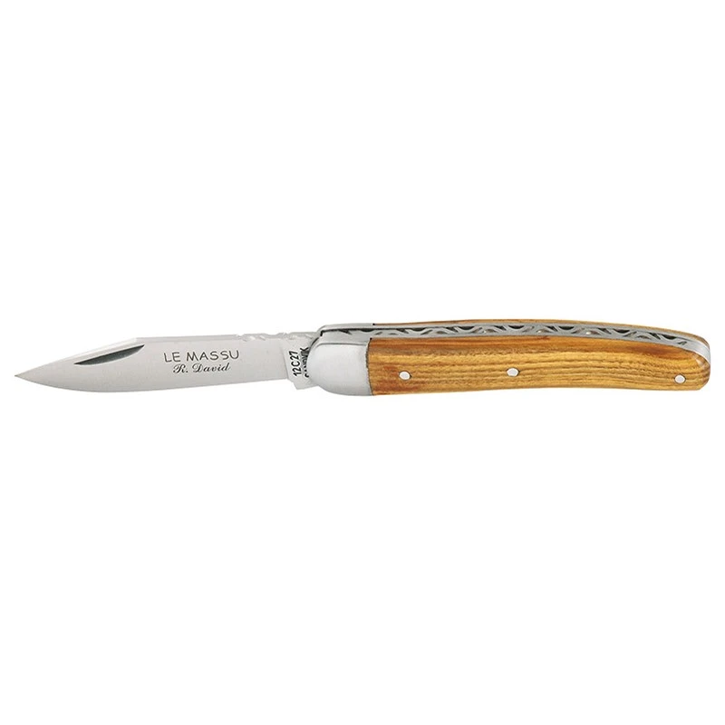 Conçu et fabriqué en France, à Thiers, le couteau de poche Robert David Le Massu possède ici un manche en bois olivier, mesurant 10cm de longueur pour la facilité de port, mais aussi le confort de prise en main. Un manche en olivier qui est sublimé par un beau ressort guilloché, mais aussi une mitre en acier inoxydable. On soulignera la présence de 3 petits rivets en acier inox, apportant une touche décorative indéniable. Un couteau de qualité signé Robert David, un artisan coutelier 100% Français !