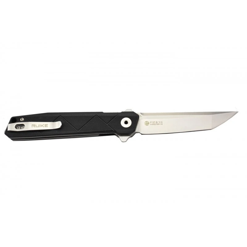 Le couteau Ruike, modĂšle P127-B, possĂšde une lame finement plate, de forme tanto, fabriquĂ©e en acier inoxydable 14C28N, capable de perforer/couper avec puissance. Une lame dure (58/60HRC), stable et rĂ©sistante, mesurant 91mm de longueur pour ĂȘtre trĂšs prĂ©cis. Une lame tanto, satinĂ©e, pouvant ĂȘtre ouverte aisĂ©ment grĂące au flipper, Ă verrouillage liner lock, avec systĂšme Thumb up empĂȘchant la fermeture accidentelle de la lame en utilisation. PossibilitĂ© de personnalisation via le bouton ajouter une gravure, prĂ©sence initiale de l’inscription Ruike.