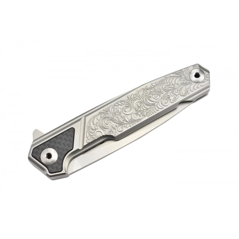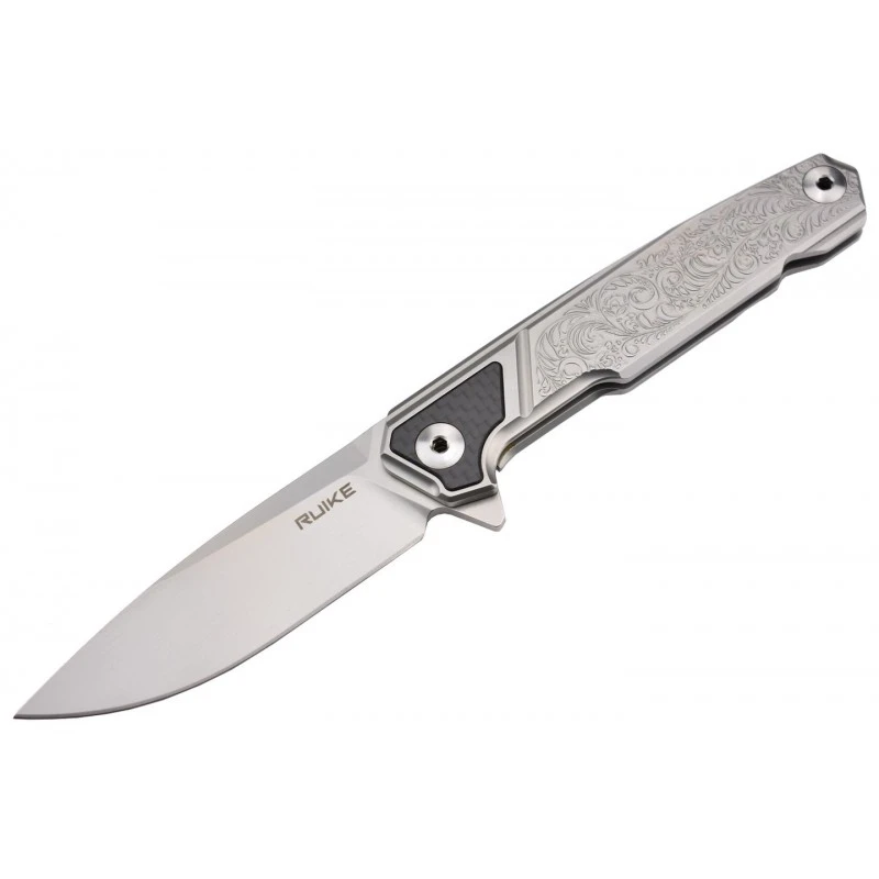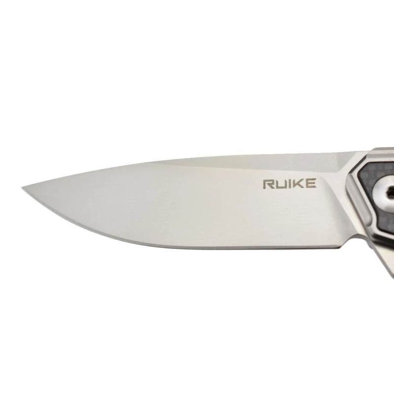 Le couteau Ruike P875-SZ va vous en mettre plein la vue, notamment par son manche en acier, avec insert en fibre de carbone, et décoré d’un magnifique motif en filigrane. Il faut l’avouer, la poignée est vraiment très belle, elle ne manquera pas d’attirer le regard, elle assure aussi une facilité de port quotidienne grâce au clip de poche ainsi que sa longueur d’à peine 20cm. On soulignera la présence d’un verrou sur le manche, afin d’éviter les ouvertures accidentelles, non désirées si vous préférez.