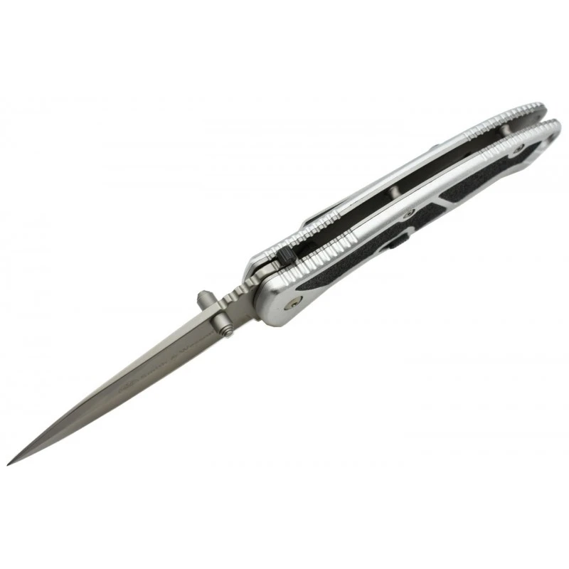 Le couteau Smith & Wesson SWATL dispose d’un manche de 123mm de longueur construit en aluminium et ses inserts en caoutchouc noir type « papier de verre » améliorant l’adhérence. Un verrou de sécurité est de la partie pour éviter toute ouverture de lame accidentelle. La poignée intègre aussi un trou de lanière ou encore « passe-lacet » au niveau de son extrémité.