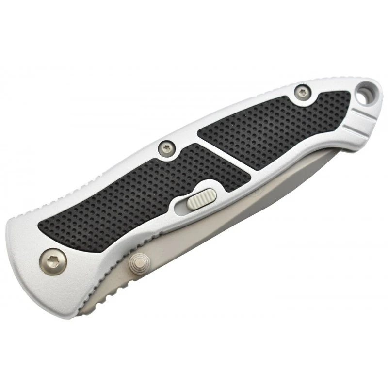 Le manche du couteau Smith & Wesson S.W.A.T M est conçu en aluminium et ses inserts en caoutchouc noir au centre pour une meilleure adhérence dans la main. Qui plus est, cela ajoute une touche esthétique particulièrement appréciable ! Le verrou de sécurité permet d’être certain que la lame ne viendra pas s’ouvrir durant le transport.