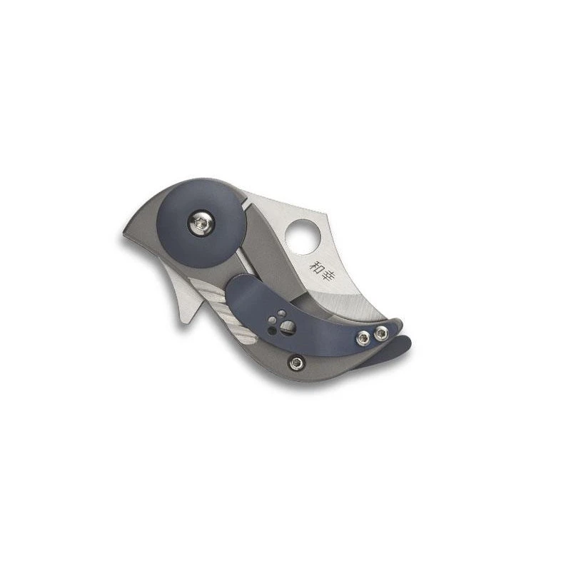 Le couteau Pochi Spyderco possède également un manche de 65mm de longueur en titanium finition bead-blasted, avec pivot. On observe aussi une queue pliante qui fait bien sûr référence au chien, ainsi qu’un clip de poche en titanium anodisé bleu qui ne manquera pas de simplifier les déplacements quotidiens. Petit, mignon et performant, un compagnon de premier choix, qui ne vous laissera jamais tomber !