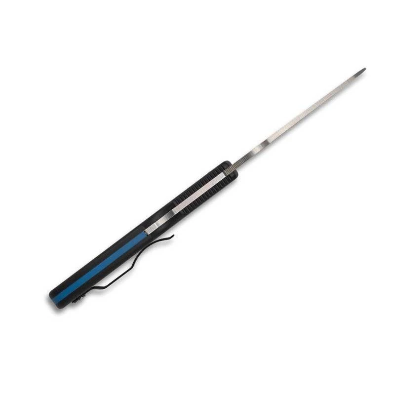 Le couteau Rescue 3 Thin Blue Line doit son nom en raison de son manche en nylon renforcé en fibre de verre que l’on appelle également FRN. Il est enrichi d’une entretoise en nylon/fibre de verre bleu, une couleur qui fait référence aux forces de l’ordre en plus de conférer une note esthétique supplémentaire. Solide, la poignée texturée est également des plus ergonomiques : cela se traduit par un couteau pliant qui tiendra bien en main. Un clip de transport noir est présent au dos du manche pour vous permettre de l’emporter partout avec aisance.