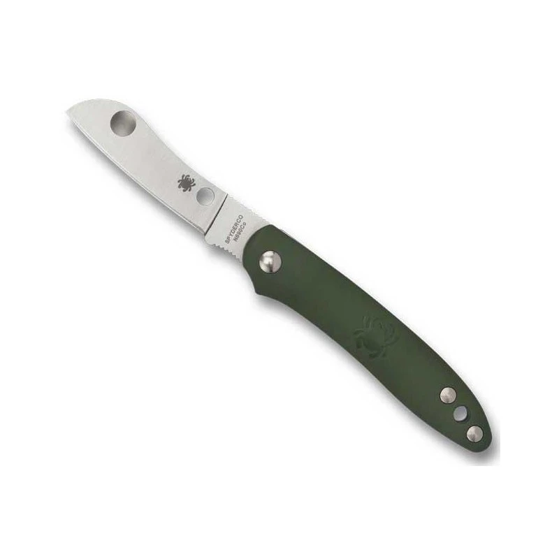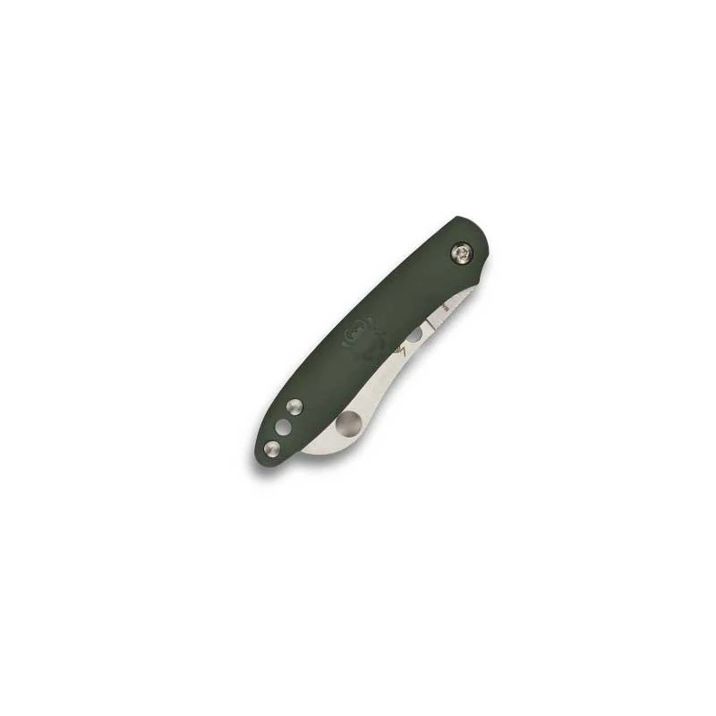 Ce modĂšle Spyderco C189PGR correspond Ă la version vert olive du Roadie. Un petit couteau pliant Slip Joint compatible avec les recommandations de la TSA. Le Roadie possĂšde une lame pied de mouton, dit Sheep Foot, mesurant 53mm de long, et fabriquĂ©e en acier N690Co Ă haute performance. L’acier utilisĂ© comprend du cobalt, molybdĂšne ainsi que vanadium. On retient plus spĂ©cialement sa Double Dent, sans oublier pour autant son dĂ©cor Spyderco ainsi que sa protection contre les fermetures accidentelles. L’ouverture se fait facilement Ă deux mains, sans ongle. Ce couteau Roadie par Spyderco possĂšde un manche coloris vert olive conçu en FRN, il s’agit de nylon associĂ© Ă de la fibre de verre. Cela permet d’apporter du confort de prise en main tout en apportant de la soliditĂ©, de la robustesse : que demander de plus ? La poignĂ©e olive est marquĂ©e par le motif Spyderco, on retrouve aussi un passe-lacet au bout pour que le transport ne soit jamais un problĂšme.