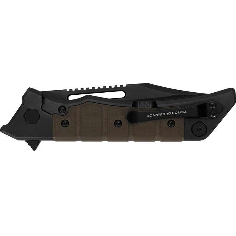 Conçu par le designer Tim Galyean, le couteau Zero Tolerance 0223 a une allure très militaire. Il faut dire qu’il possède une lame clip point fabriquée en acier CPM 20CV avec revêtement DLC (Diamond-Like Carbon) à la finition non éblouissante. Ajourée, la lame noire est décorée par le logo ZT en blanc, elle est très résistante à l’usure ainsi qu’aux chocs. Possibilité de la graver par un texte (au recto comme au verso, voir bouton ajouter une gravure ci-dessous). Esthétique, la lame est sublimée par de petits ajours arrondis le long de la colonne vertébrale, à proximité de la poignée.