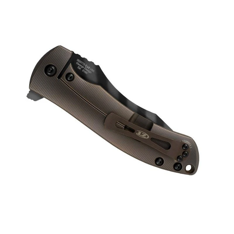 Le ZT 0920TTS Sprint Run 2019, c’est aussi un manche mesurant 13cm de longueur conçu en titanium anodisé bronze, avec entretoise aluminium anodisé noir. Afin de garantir une transportabilité optimale, la poignée est équipée au dos d’un clip titanium bronze. Un manche usiné en 3D qui épouse de ce fait parfaitement la forme de la main pour des utilisations toujours très confortables. Le Zero Tolerance 0920TTS, un couteau pliant au look sobre mais agressif : vous allez l’adorer !
