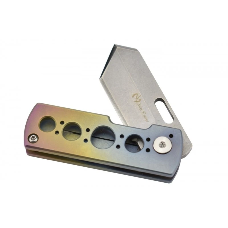 Ce modèle MK150, signé Max Knives, est un mini couteau pliant, facilement transportable au quotidien. Il est vrai que son manche de 6cm de long permet de le ranger n’importe où, même dans une petite poche. Ainsi il sera en permanence à vos côtés, sans que vous le sachiez ! La poignée est conçue en titane anodisé, ajourée à multiples reprises par des ronds de tailles diverses, elle comprend plusieurs nuances de couleurs pour un effet très stylé, très design. On mentionnera qu’ici, le verrouillage de lame est de type frame lock.