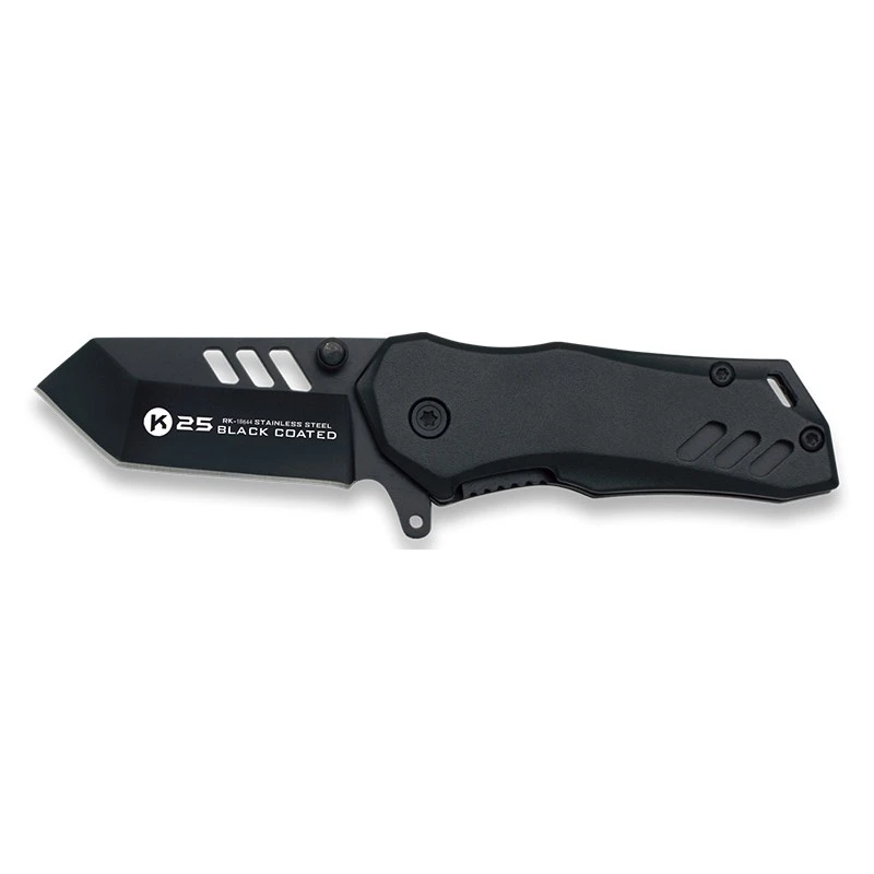 Le K25 18644 est un couteau de poche tactique conçu en Espagne, qui pourra ĂȘtre transportĂ© de façon trĂšs simple du fait de son trĂšs petit gabarit. En position fermĂ©e, il ne mesure que 75mm de longueur ce qui correspond Ă la taille de son manche construit en aluminium noir. Ce dernier comporte une entaille qui est en rĂ©alitĂ© un trou pour laniĂšre, de sorte Ă amĂ©liorer toujours un peu plus la transportabilitĂ©.