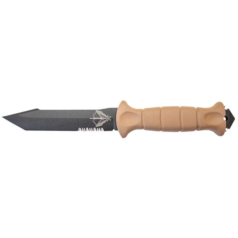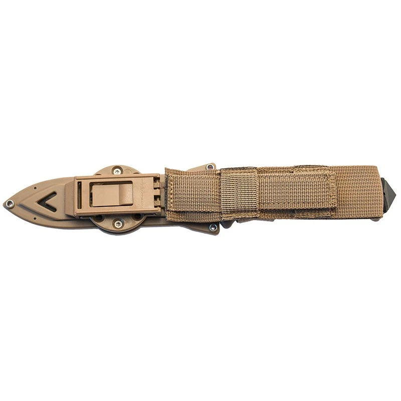 Le couteau Wildsteer Blade H4 possède un manche symétrique en tactiprène coloris sable offrant un grip soft touch doux et confortable. D’ailleurs, on observe deux évidements de rotation permettant de rendre la maniabilité extrêmement bonne. Le Blade H4 intègre également un brise-vitre pour les situations d’urgence, comme casser la verrière d’un hélicoptère par exemple. Votre poignard Wildsteer vous sera livré avec son étui POM en nylon avec attache MOLLE.